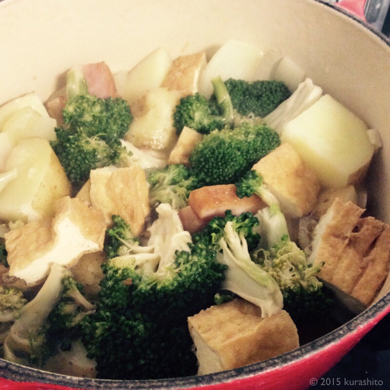 - しばらくしたら適度な水も加えて、冷蔵庫にあった厚揚げも加えて、弱火でコトコト。